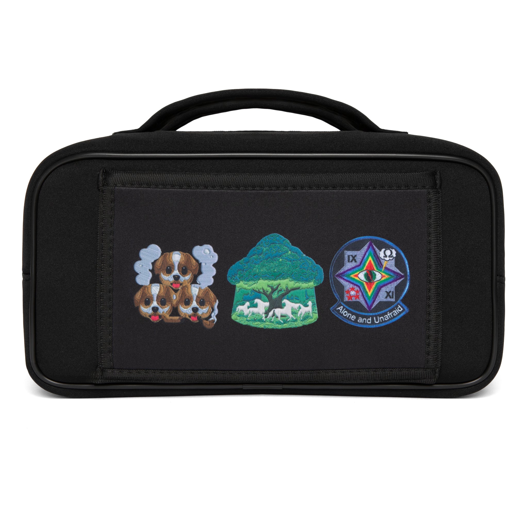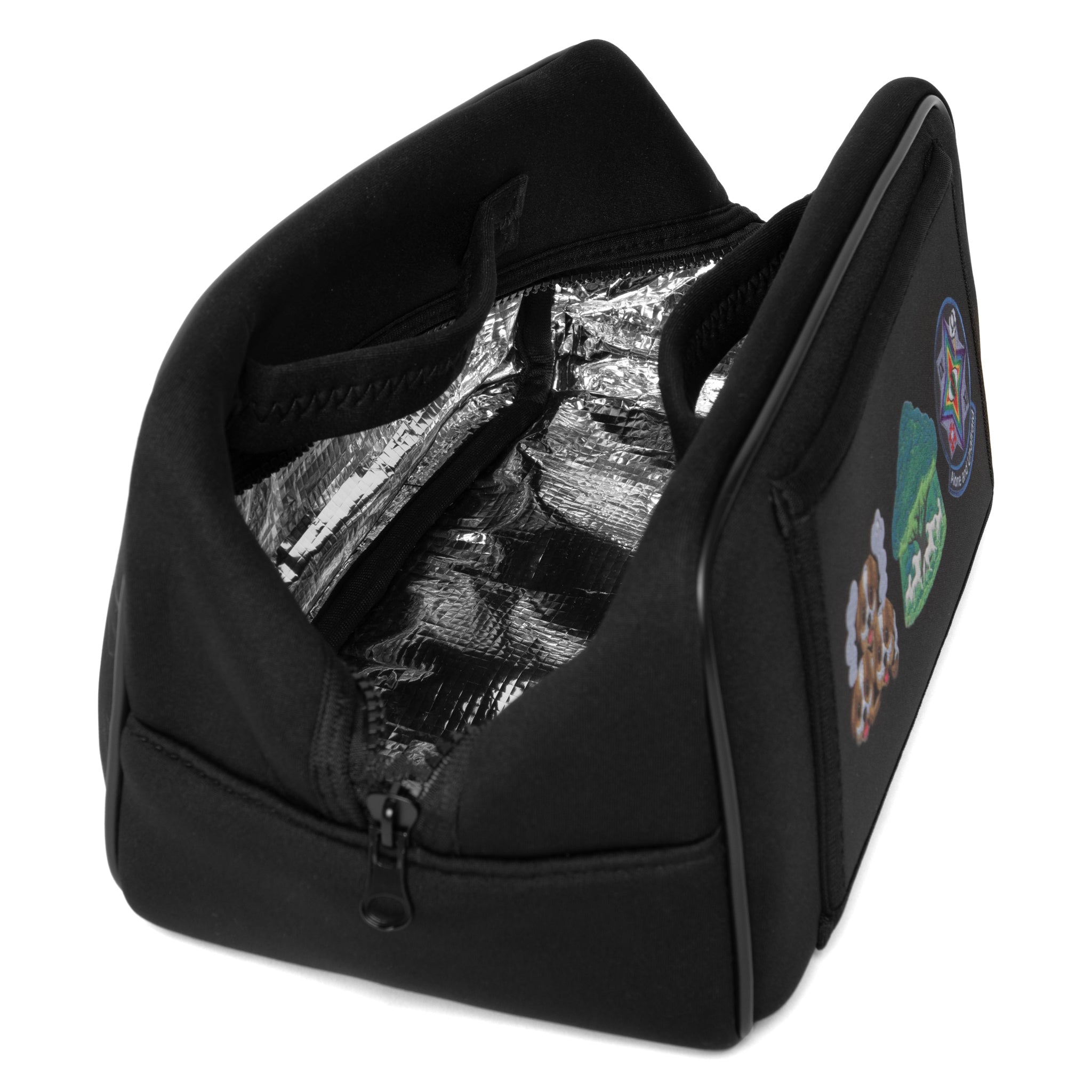 (L) 11" x (W) 6" x (H) 6"Neoprene construction with structured base and sidewall, plus piping for added structureMain zip compartment with patch pocket at rear (7.25" x 4.75")Thermal foil lining helps insulate and protect heat-sensitive contentsDual carry handles at topCustom digitally printed graphics at front and rear